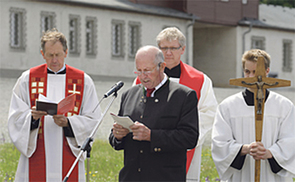 Bischofsvikar Wilhelm Vieböck (Mitte) und Pfarrprovisor Friedrich Traunwieser (l.) mit den fünf Beauftragten und MinistrantInnen beim Vaterunser. © Sepp Huber